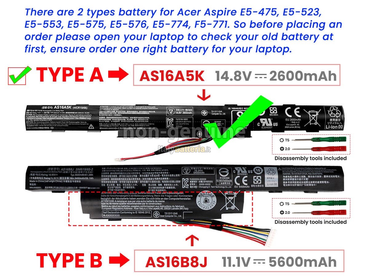 Con la copia 1: 1 in base alla dimensione originale della batteria originale, la batteria Acer Aspire E5-523G-620Y sostitutiva è compatibile al 100% con la batteria originale.