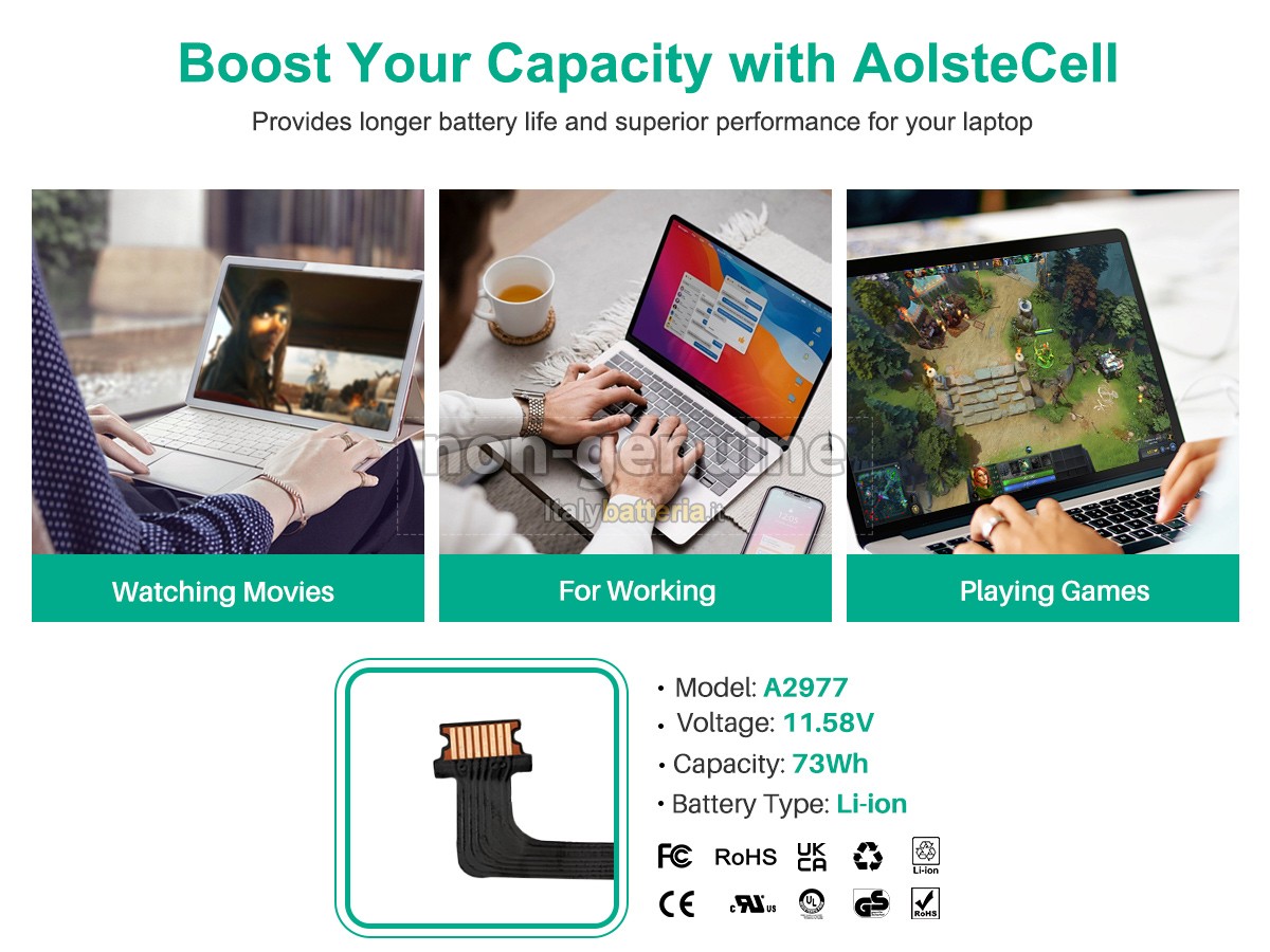 La batteria sostitutiva Apple A2977 è progettata in scala 1:1 rispetto alla batteria originale, assicurando il 100% di compatibilità in termini di forma, dimensioni e prestazioni.