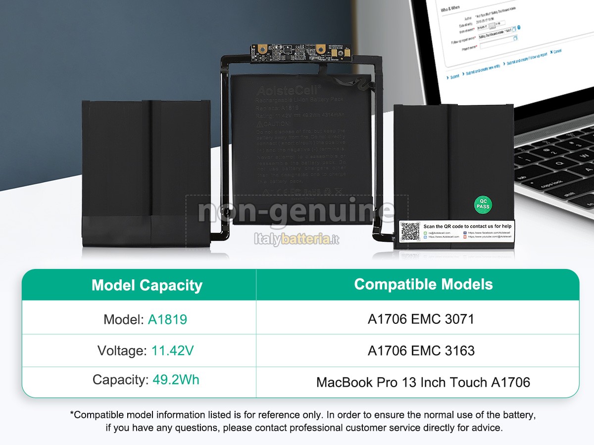 La batteria sostitutiva Apple MacBook Pro 13 inch TOUCH A1706(Mid 2017) è progettata in scala 1:1 rispetto alla batteria originale, assicurando il 100% di compatibilità in termini di forma, dimensioni e prestazioni.