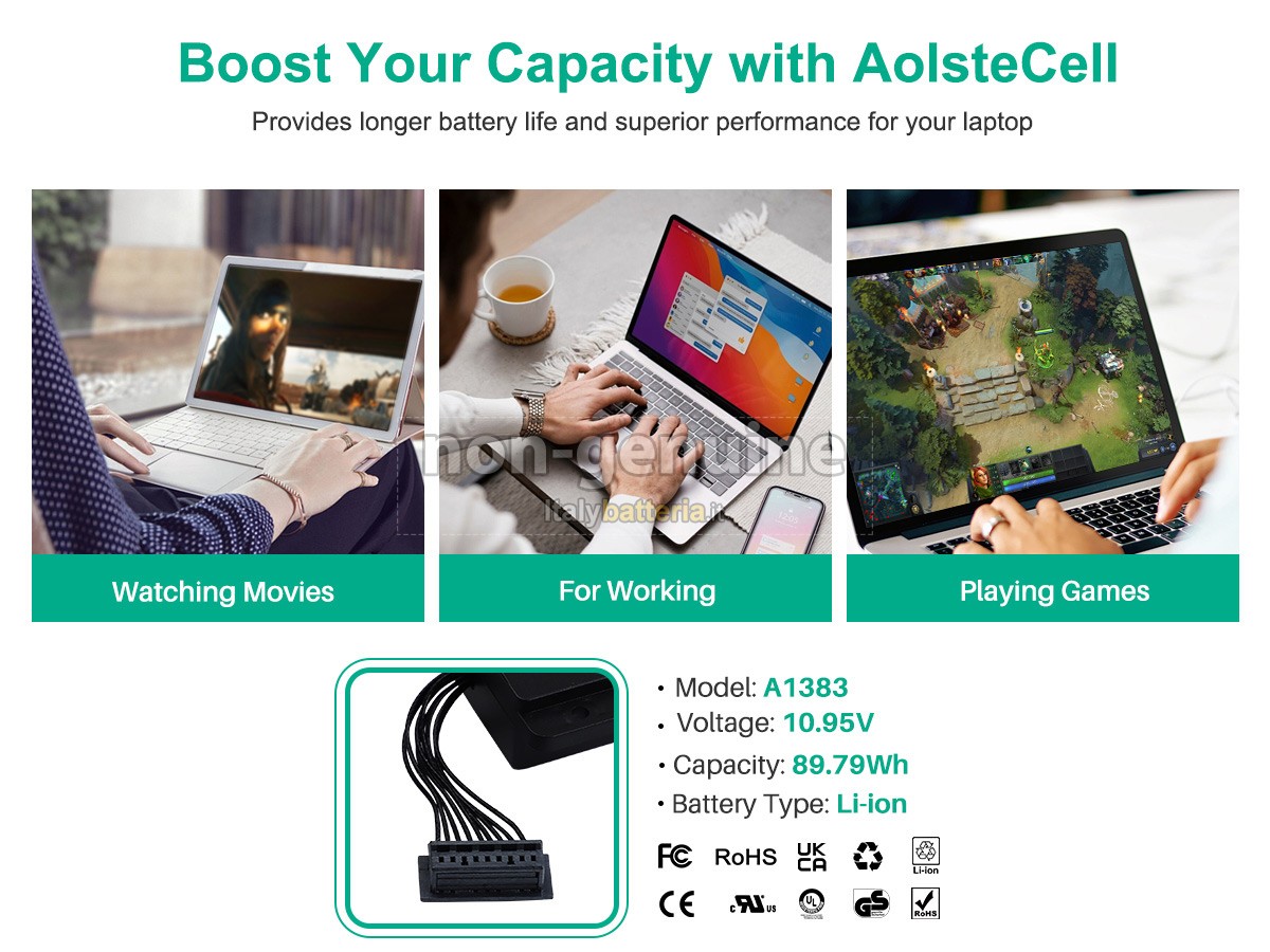 La batteria sostitutiva Apple MacBook Pro 17 inch MD311B/A è progettata in scala 1:1 rispetto alla batteria originale, assicurando il 100% di compatibilità in termini di forma, dimensioni e prestazioni.
