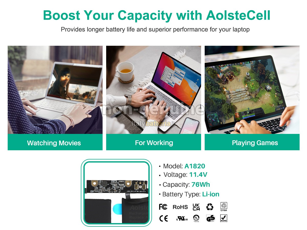 Ogni batteria per Apple MPTT2LL/A* viene sottoposta a severi test di sicurezza prima della spedizione, garantendo robustezza, durata e protezione da sovraccarichi, cortocircuiti e surriscaldamenti.