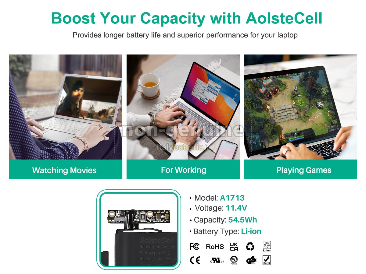 La batteria sostitutiva Apple MPXQ2LL/A è progettata in scala 1:1 rispetto alla batteria originale, assicurando il 100% di compatibilità in termini di forma, dimensioni e prestazioni.