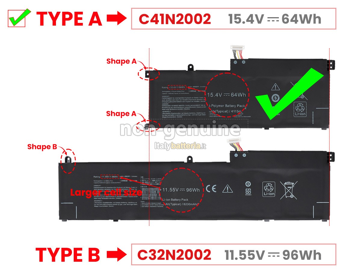 Con la copia 1: 1 in base alla dimensione originale della batteria originale, la batteria Asus ZenBook Pro 15 UM5500QA sostitutiva è compatibile al 100% con la batteria originale.