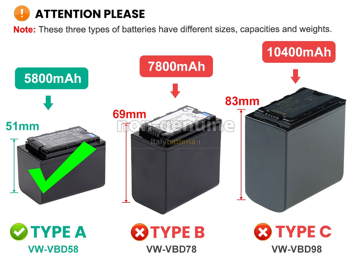 Con la copia 1: 1 in base alla dimensione originale della batteria originale, la batteria Panasonic VW-VBD78 sostitutiva è compatibile al 100% con la batteria originale.